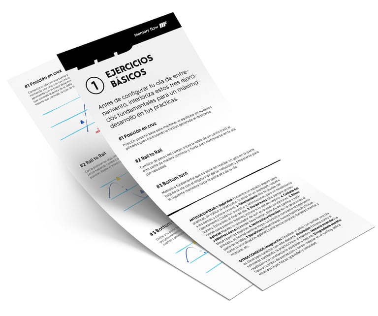 No se trata de que adquieras nuestro simulador de surf y ya está. En el interior del packaging encontrarás dos documentos donde te proponemos 3 ejercicios básicos y 5 modelos de ola para tu máxima evolución.